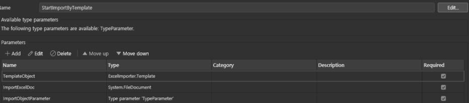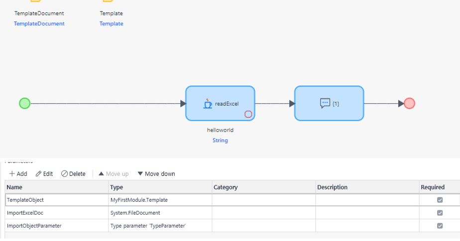 Entity와 화면이 끝났으니 로직을 만들어줄 차례이다. 로직도 간단하게 JavaAction만 추가하고 파라미터 설정을 해주었다. 파라미터 설정도 ExcelImpoter에 있는 파라미터를 참고했다.