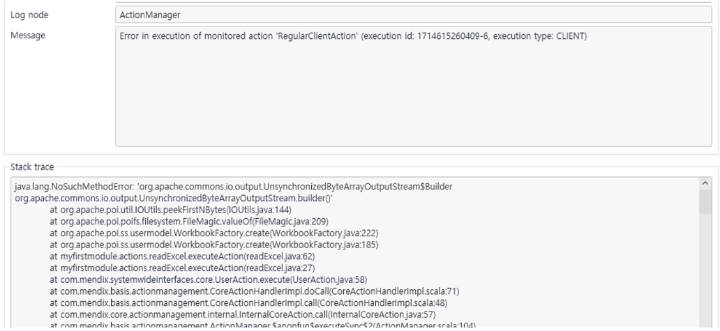 [JavaAction] Error reading Excel using Poi 0 mendix version 10.6.7 I wanted to read Excel data using JavaAction and Poi. So, I put the poi and other dependency library files in the userlib folder, wrote the source code, and executed it, but I encountere